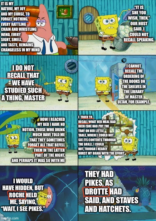 Yeah, I don’t want to cast aspersions too much. I could see what Gene’s getting at, and it is absolutely literary in a way that not enough sci-fi is, but the mix didn’t work for me, and I just didn’t want to spend time with that crew or see where Severian was going to end up. Or rather, given the narrative’s structure, how he was going to end up where he ends up.