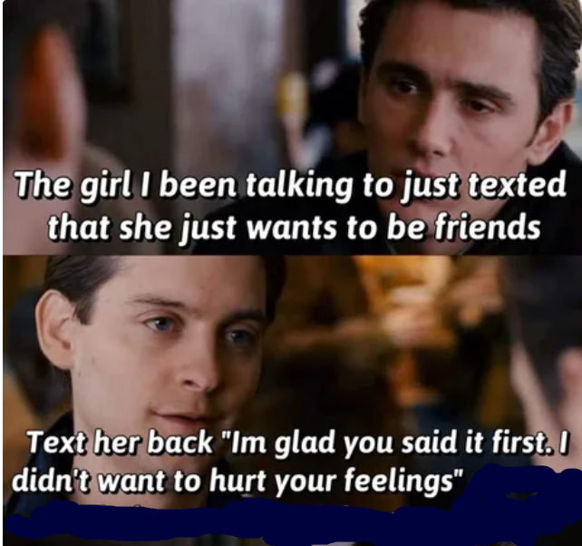 minus-squareMNByChoice@midwest.sociallinkfedilinkarrow-up15arrow-down1·4 months ago "hey I like you” “i’m really sorry but i don’t see you that way, I just want to be friends” “Yeah, I really want to be friends with you. Weirdo.”