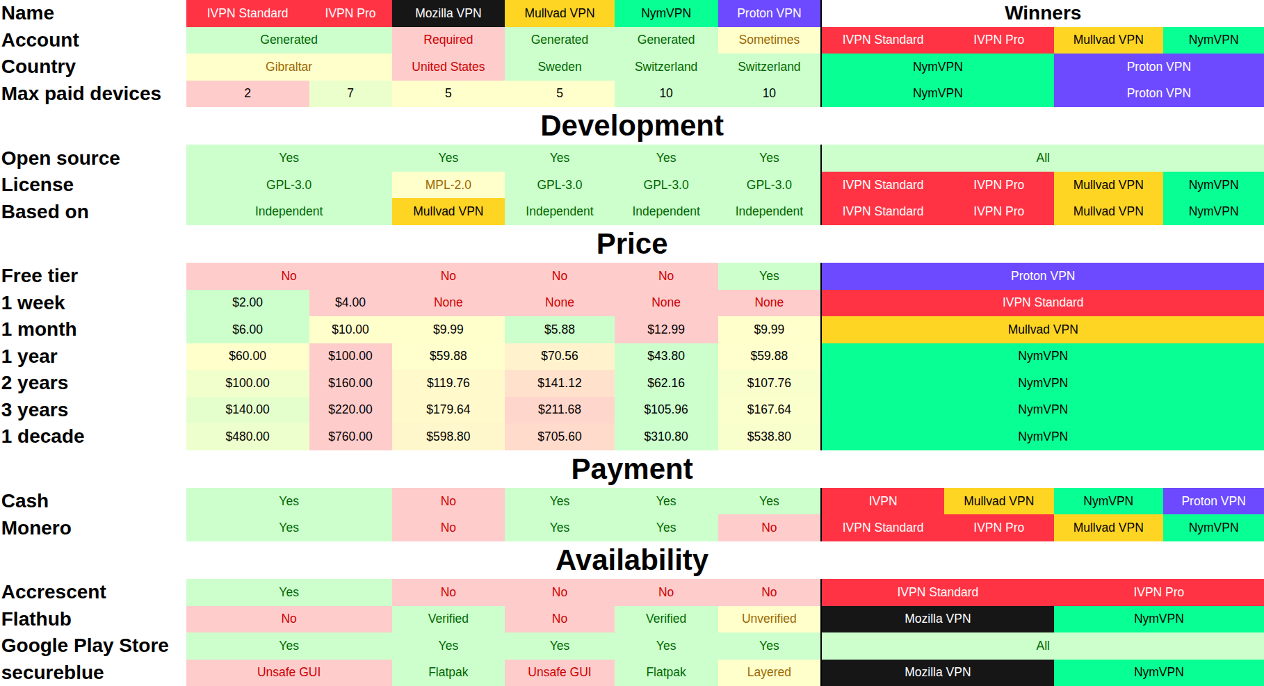 - NymVPN is very very new, but it’s off to a strong start. It wins in almost every category. I actually hadn’t heard of it until I started this project.