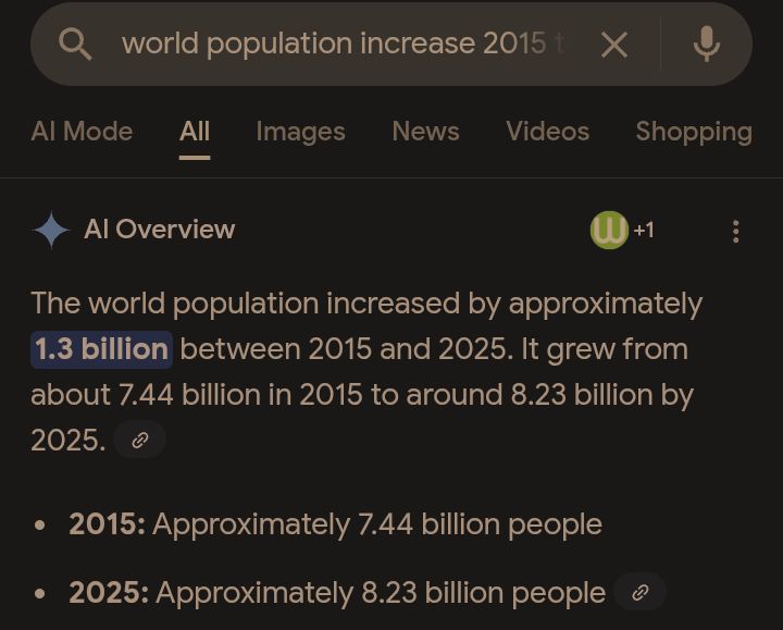 So in a way google (and others) are really dumb to let pure AI do the whole rather than to fetch and organize the work with proper tools (in this case should research the world population in 2015 and 2025 and start a calculation with a regular calculator like program)AI is great (sometimes), but the overhype over it make it used in every domain rather than useful ones…