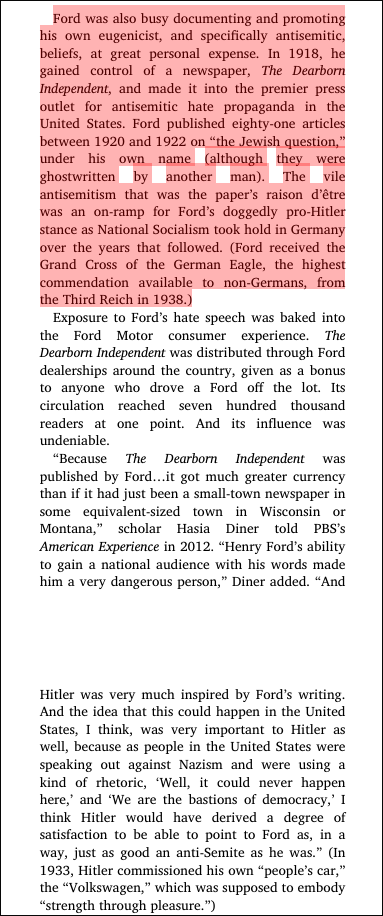 From the book: “Henry Ford was, of course, the man most responsible for inaugurating mass production of the automobile—the man who refined the car as the ultimate expression of American consumer culture. He was also a man who had some exceptionally repellent ideas about “bloodlines.” As Jonathan Greenblatt of the Anti-Defamation League said on Twitter at the time of Trump’s remarks, “Henry Ford was an antisemite and one of America’s staunchest proponents of eugenics”