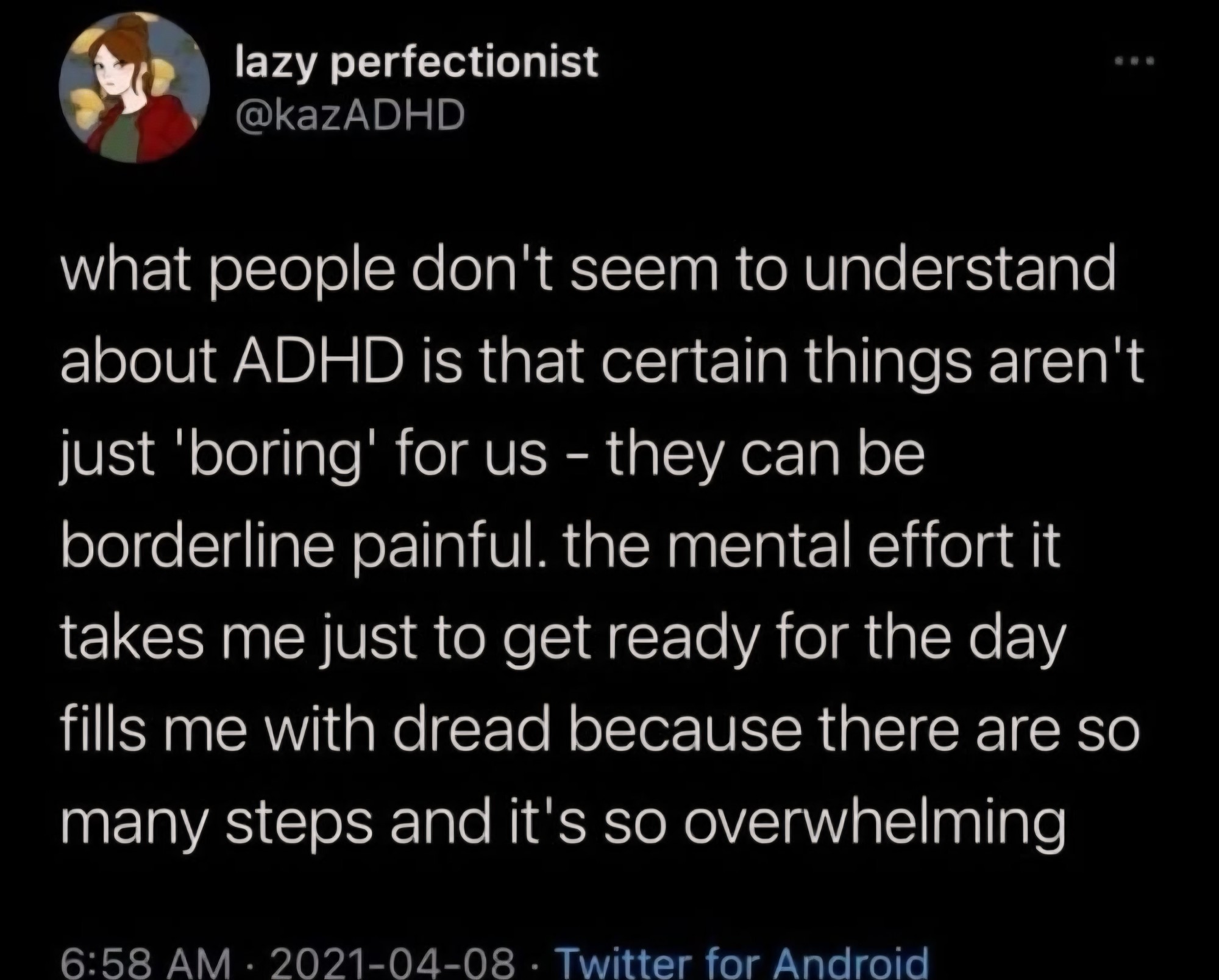 So true. It’s a mental weight or barrier that creates physiological responses. The thought of having to do whatever task creates almost a feeling of revulsion or claustrophobia, being trapped. I’m self aware enough to see it coming, but that doesn’t mean I can get past it. The job or task may not get done until it’s urgent, and if it’s never urgent…who knows? <—- and that’s what makes ADHD a problem vs “hurr durr nobody likes doing boring stuff so everyone’s adhd…”