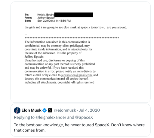 Email from Jeffrey Epstein to Elon Musk on the February 26th (after the visit) thanking him for the tour of Space X :