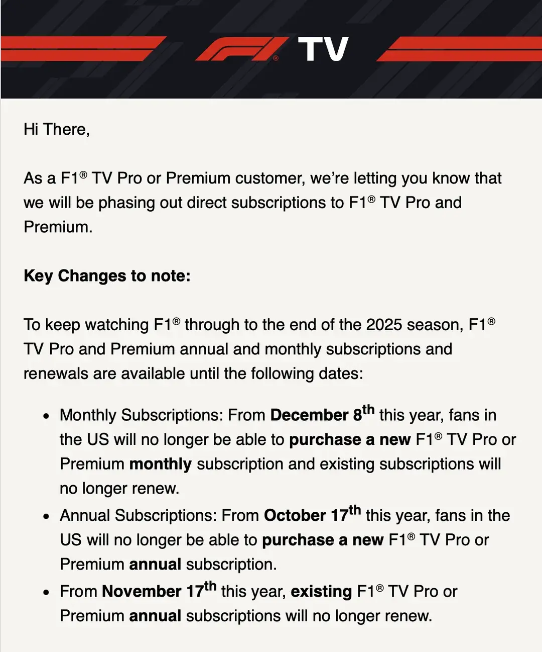 alphacyberranger@sh.itjust.worksEnglish · 3 days agoF1 TV Subscriptions will no longer be available in the US after December 8thsh.itjust.worksimagemessage-square20fedilinkarrow-up130arrow-down12