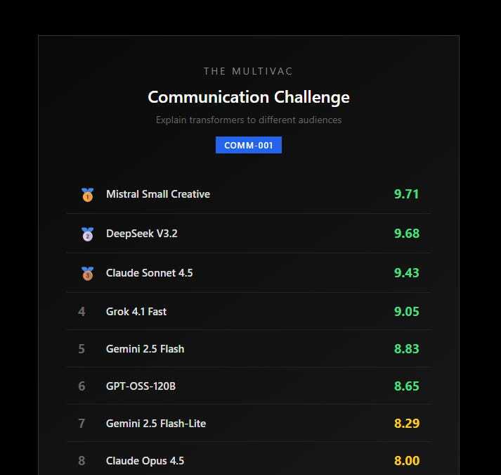 arrow-up19arrow-down1external-linkMistral Small Creative beats Claude Opus 4.5 at explaining transformers — 50x cheaper, higher scoresplus-squaresubstack.com☆ Yσɠƚԋσʂ ☆@lemmy.mlcakeEnglish · 1 day agomessage-square0fedilink