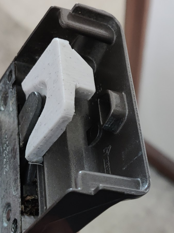 The plastic part inside this latch broke, and I wanted to print a replacement. I was genuinely surprised at how straightforward it was!! This is my first draft: it fit and worked fine! I made a second version with a few cutaways around the corners, and that was the final draft. (I forgot to take a picture of that one.)