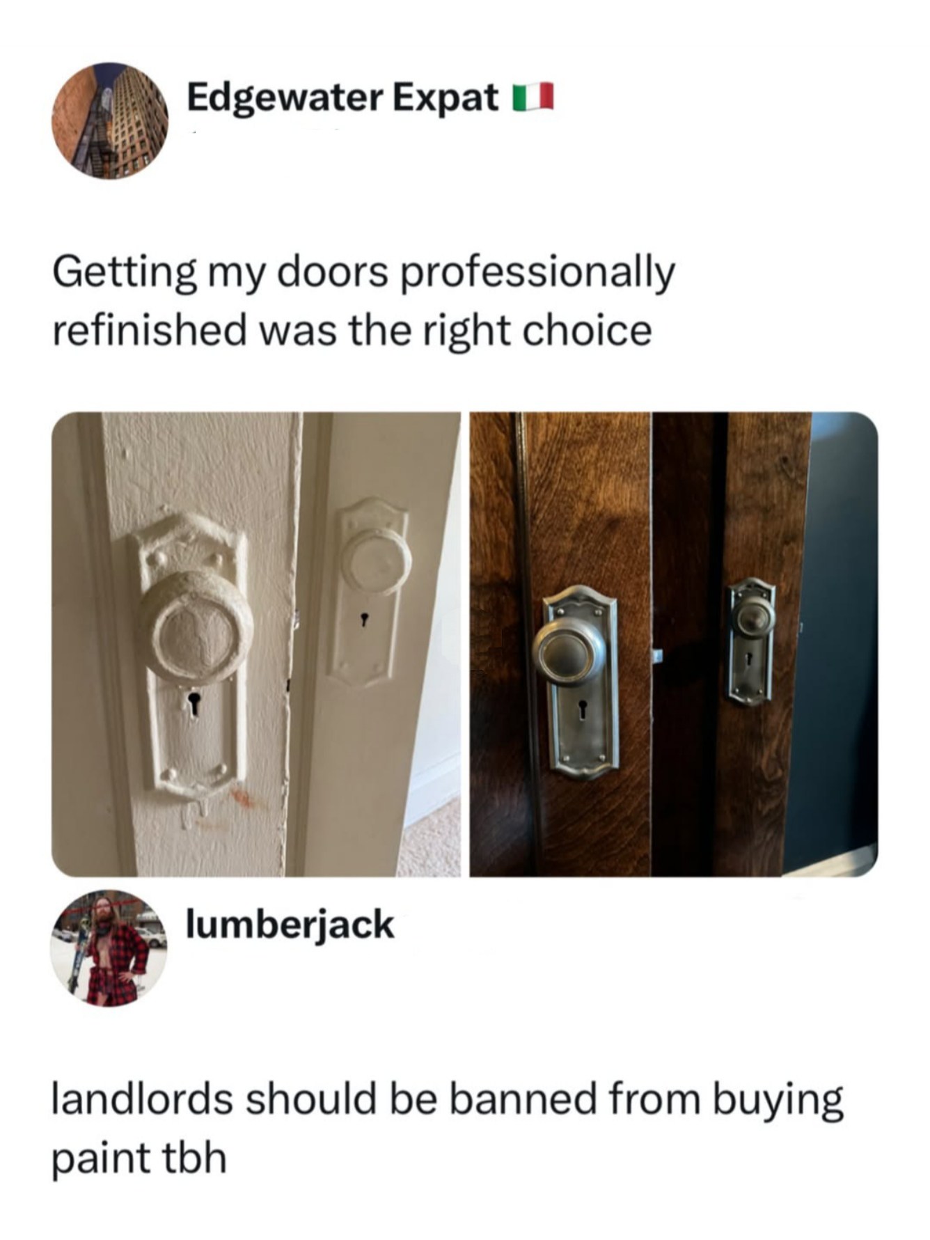 If it was quality paint, perhaps. But you know a landlord is gonna go for the cheapest shit that’ll streak and run and chip like crazy leaving it an ugly mess that doesn’t protect anything.