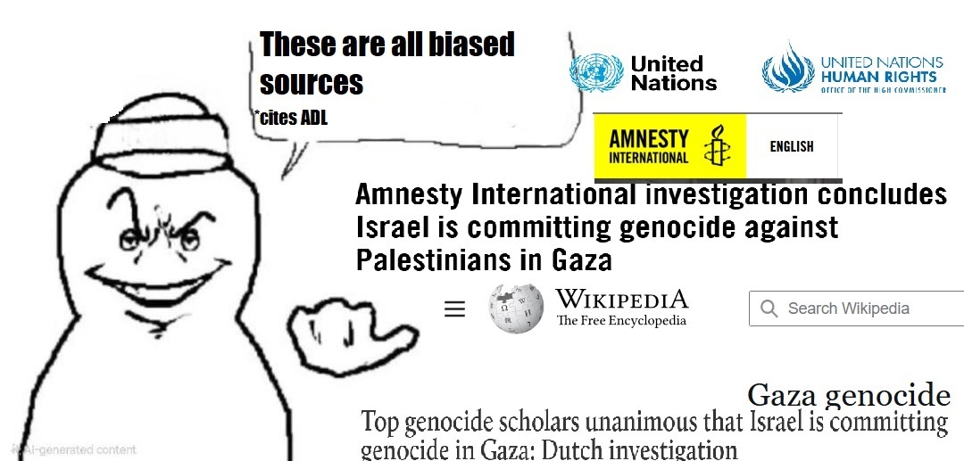 In this case they’re biased for reality since there is a genocide happening in Gaza rn. But when the person saying this also dismisses a genocide as “not genocide, it’s a war crime” and then unironically sites a source that’s ran by Zionists, that’s how you know you’re not dealing with someone who is speaking in good faith on this issue