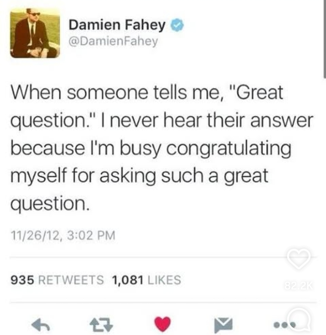 You don’t hear the answer because I use “great question” to stall and deflect because I don’t know the answer.