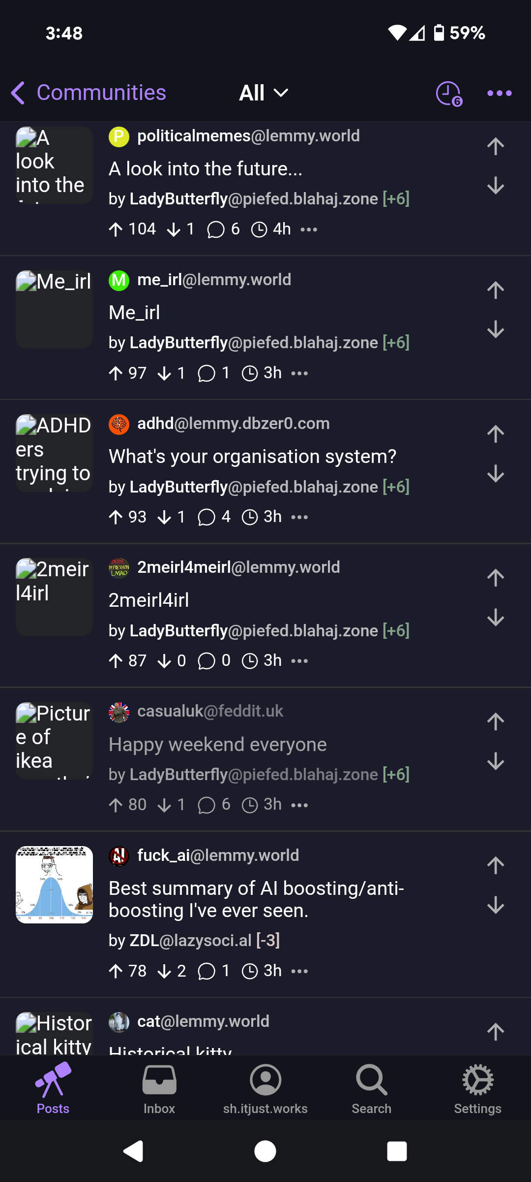 Works fine on other accounts so it’s (probably) not an app issue. Is it a spiteful mod/admin with thin skin that I hurt with a downvote? Is there somewhere other than modlogs I can look at?
