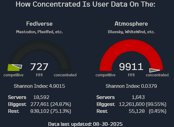 This site currently measures the concentration of user data for active users: in the Fediverse, this data is on servers (also known as instances); in the Atmosphere, it is on the PDSes that host users’ data repos. All PDSes run by the company Bluesky Social PBC are aggregated in this dataset, since they are under the control of a single entity. Similarly, mastodon.social and mastodon.online are combined as they are run by the same company.