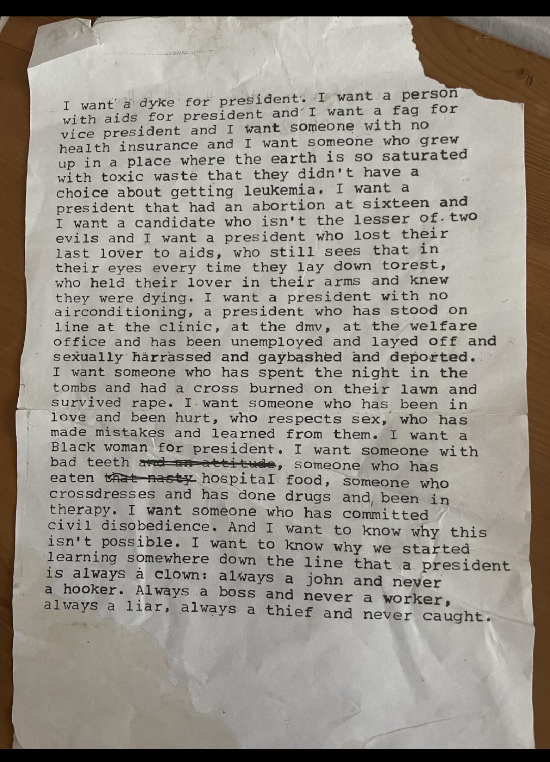 I want a dyke for president. I want a person with aids for president and I want a fag for vice president and I want someone with no health insurance and I want someone who grew up in a place where the earth is so saturated with toxic waste that they didn’t have a choice about getting leukemia. I want a president that had an abortion at sixteen and I want a candidate who isn’t the lesser of. two evils and I want a president who lost their last lover to aids, who still sees that in their eyes every time they lay down to rest, who held their lover in their arms and knew they were dying. I want a president with no air conditioning, a president who has stood on line at the clinic, at the dmv, at the welfare office and has been unemployed and layed off and sexually harassed and gaybashed and deported.