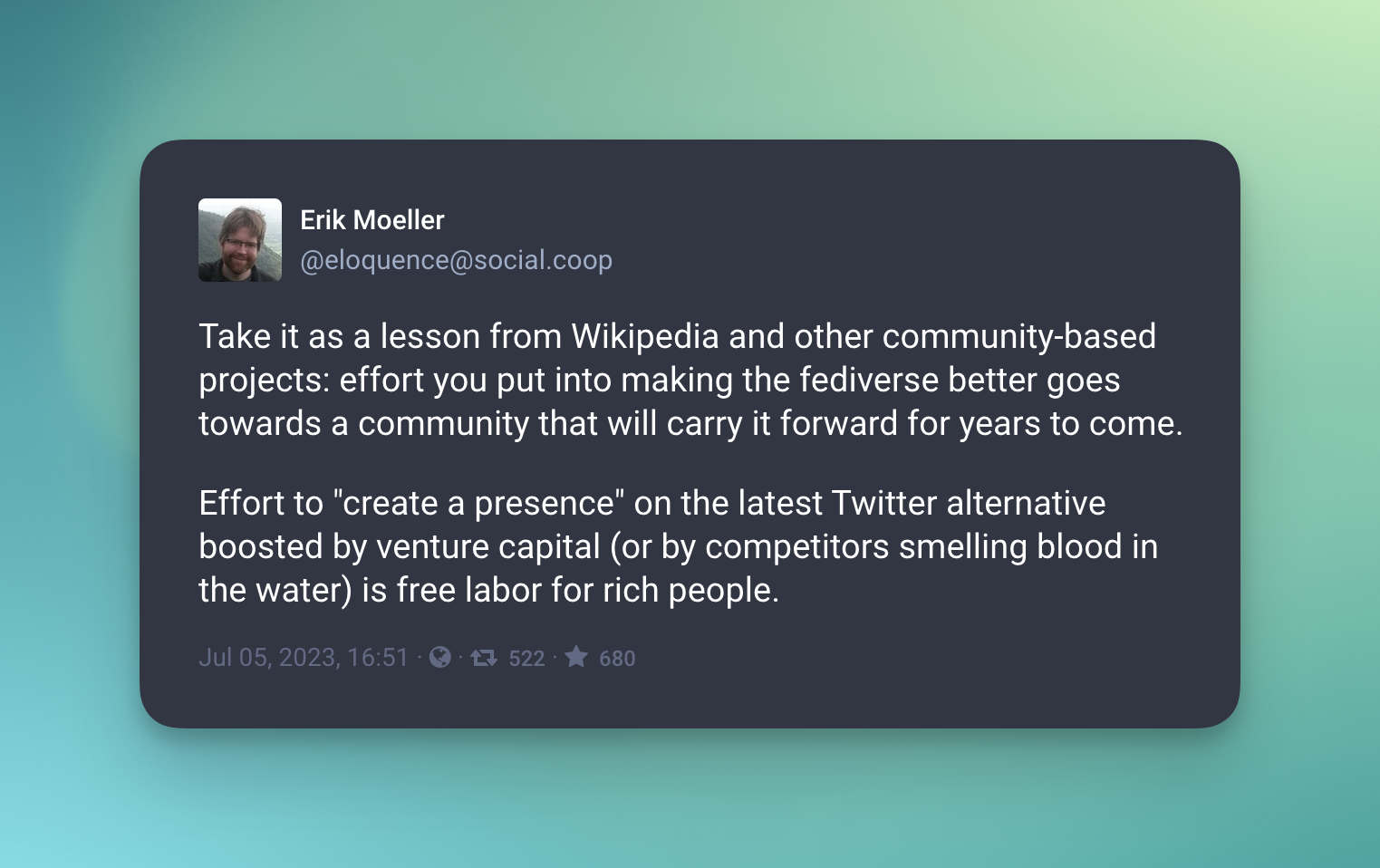 arrow-up18arrow-down1imageBuilding the fediverse is an investment in us and the open web.lemmy.worldHiramFromTheChi@lemmy.world to Fediverse@lemmy.worldEnglish · 2 years agomessage-square3fedilinkfile-text