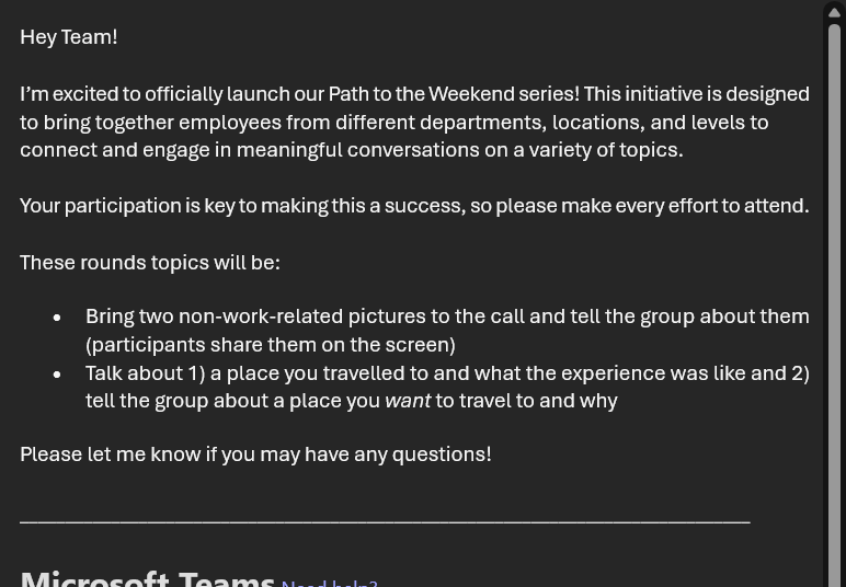 minus-squaresuperduperpirate@lemmy.worldlinkfedilinkEnglisharrow-up10·1 month agoSounds like a good time to have a meeting with an external partner that you can’t skip or reschedule. And by meeting, I mean a legit looking calendar event that will fool a cursory investigation. This works best if you have an office with a door you can shut. Or. Hell. Sounds like a good time to schedule a conflicting dental or doctor appointment.