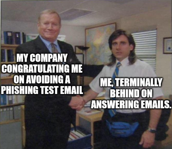 Alt text: Michael Scott Handshake meme. Managers text: “My company Congratulating me on avoiding a phishing test email”. Michael Scott text: “Me, terminally behind on answering email.”