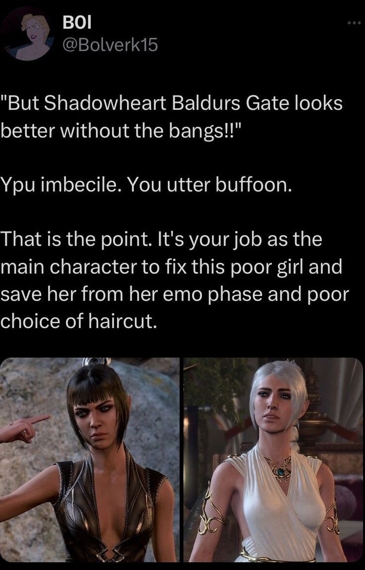 She can be fixed? I’ve never let her live very long. I’m always so annoyed by her bigotry by the time the choice comes up that I happily let her die and have Withers make me a better cleric if I need it. I guess next playthrough I’ll leave Lae’zel in her cage so I can give Shadowheart a fair chance.