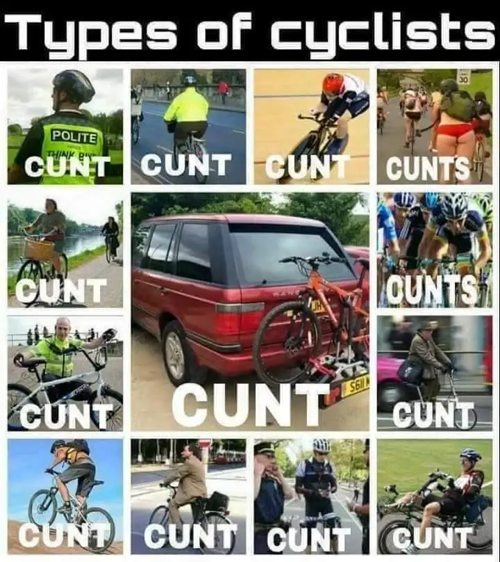 In the town nearest to me there are bike lanes all over and these dickheads still feel the need to get into traffic lanes and fuck up the flow whilst obeying no traffic laws. Fuck cyclists. Keep your toys out of cars’ way.