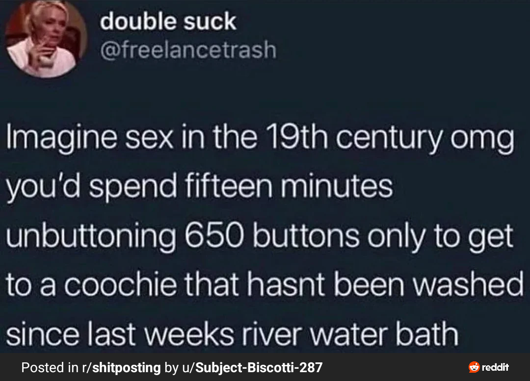 minus-squareBerlinblades@lemmy.worldlinkfedilinkEnglisharrow-up3·19 days agoLadies would use talc infused with asbestos and lead to keep fresh down below.