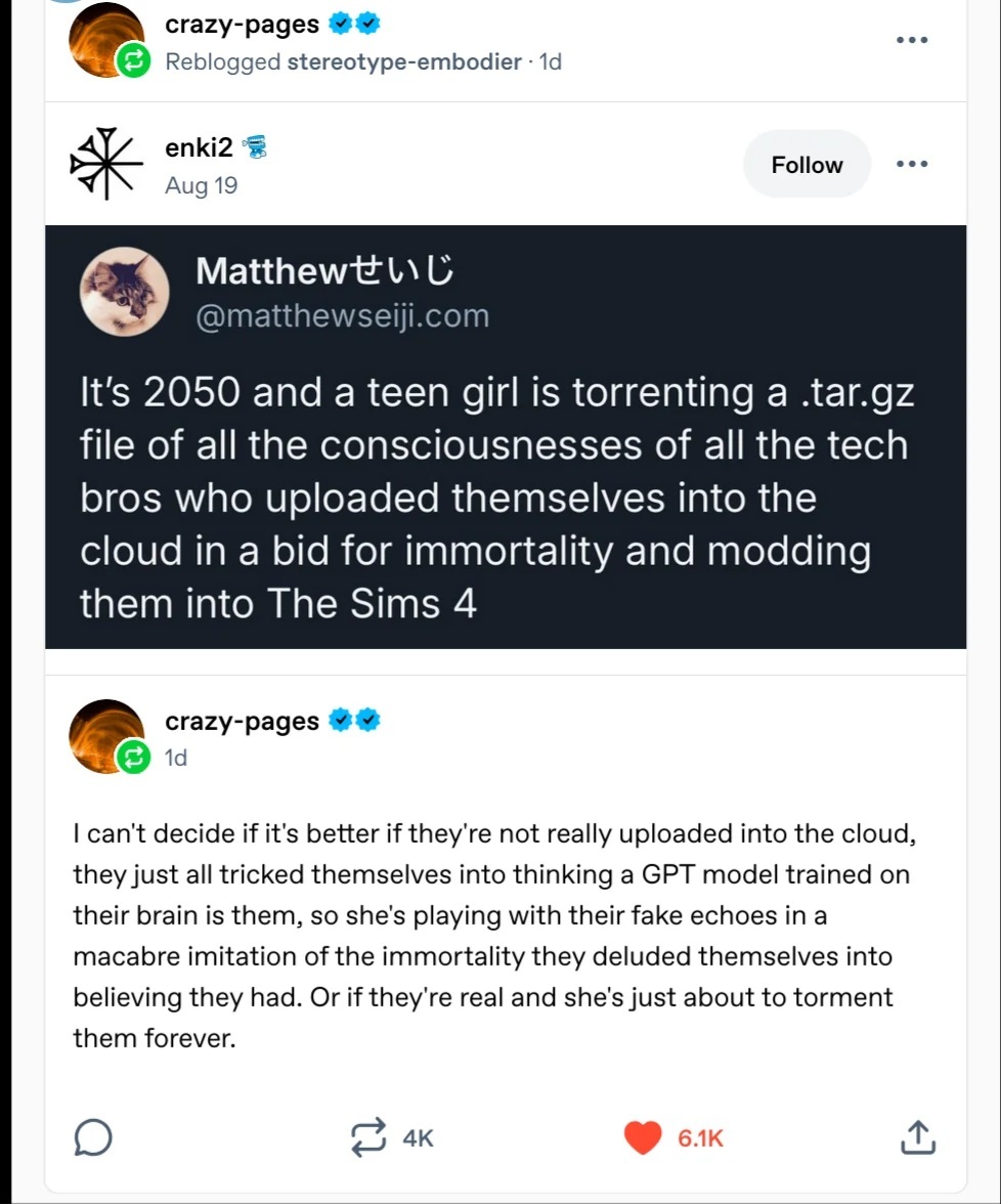 ooo, i like this version where the basilisk feasts on the digital consciousnesses of techbros and is content to leave the rest of us alone