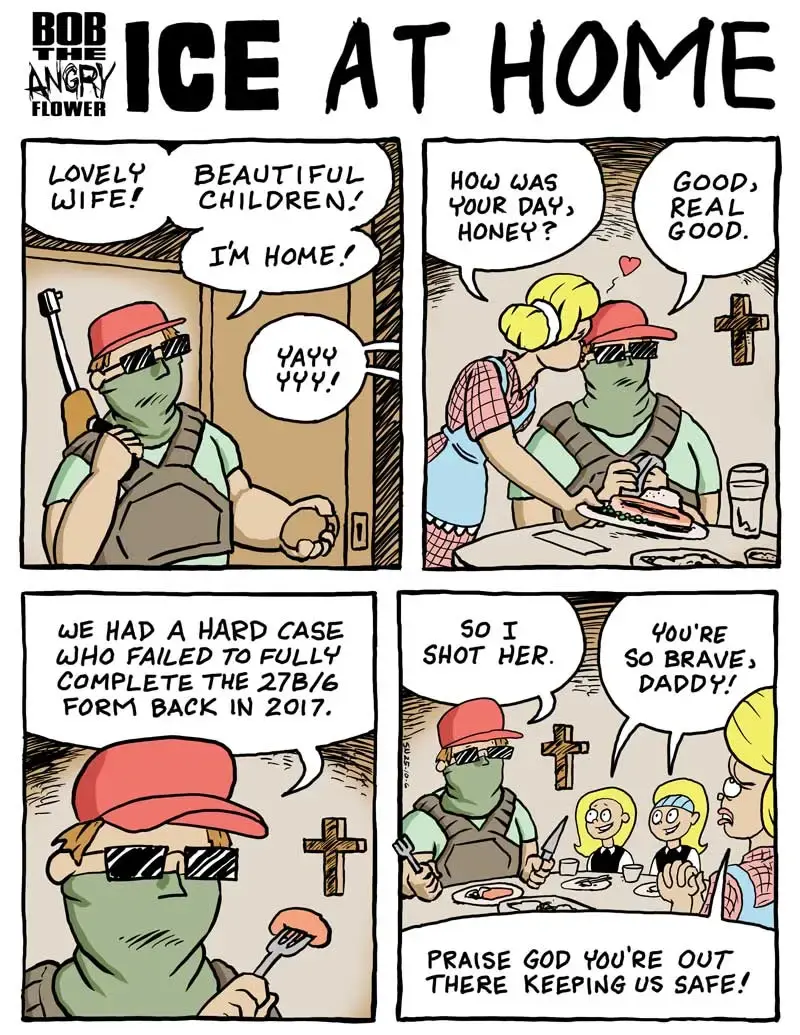 Best part would be the ICE agent father coming home every day with slightly different colored hair and different height and build every evening. He never takes off his mask, glasses or hat, so the family never know who he is … or if it’s the same person.