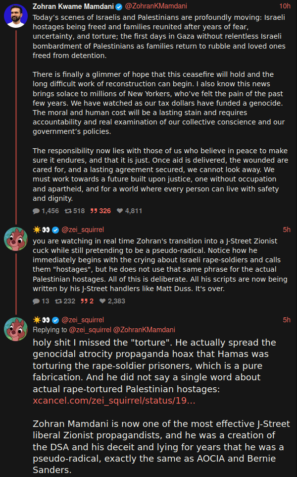 If Zohran was a milquetoast DNC shill with no past record on Palestine I’d take it. But he’s backtracking from his original position of fully supporting Palestinians, to spreading fake lies about Israeli captives being tortured while not mentioning actual Palestinians being tortured.