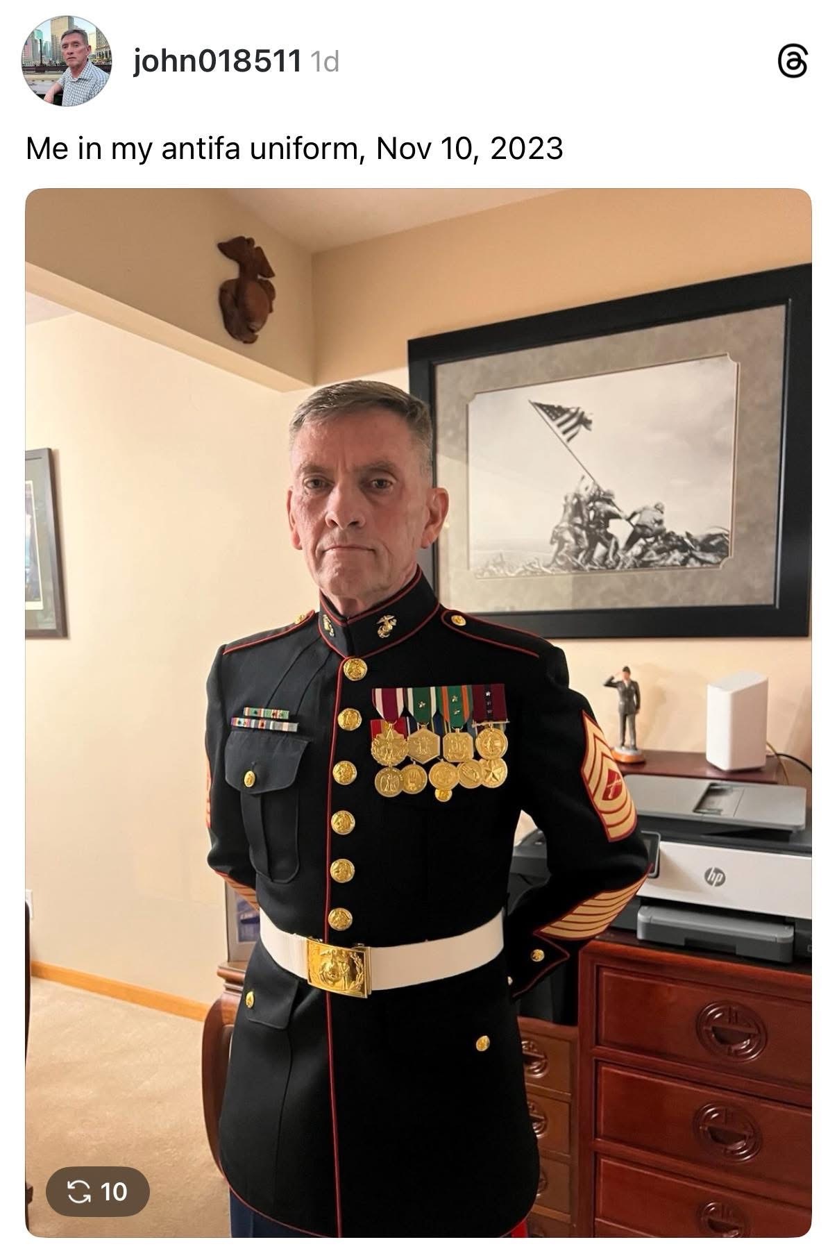 Either way, he is a Master Sargent in the US Marine Corp. He took an oath to defend the Constitution and not a single person or party. His power is bestowed by the people he is sworn to serve. If he is wearing that uniform with honor, that uniform is most definitely anti-fascist.