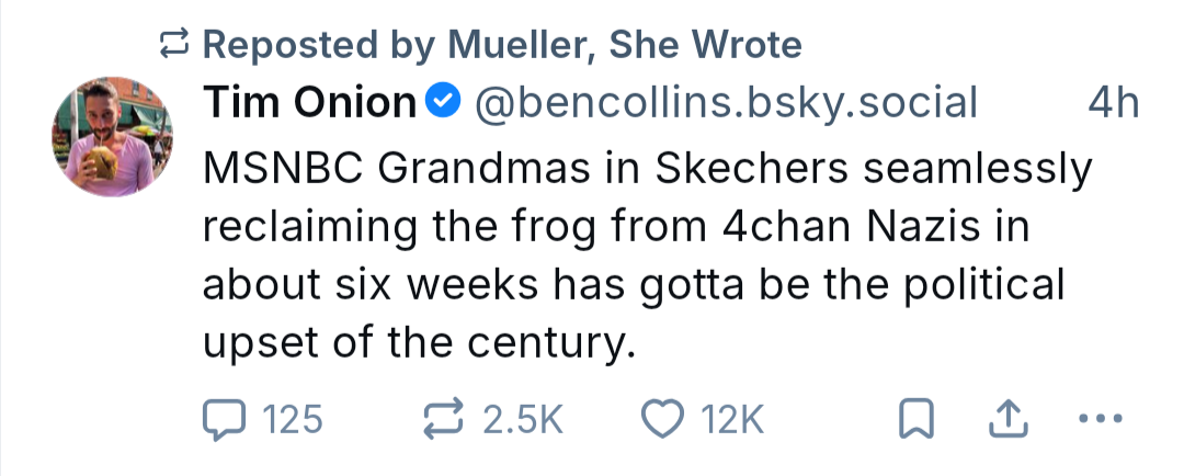 I knew about that part, but I still just straight up cannot separate pepe from fascism. I’ll start reading the memes more, though, when they pop up, instead of just straight down voting and skipping em