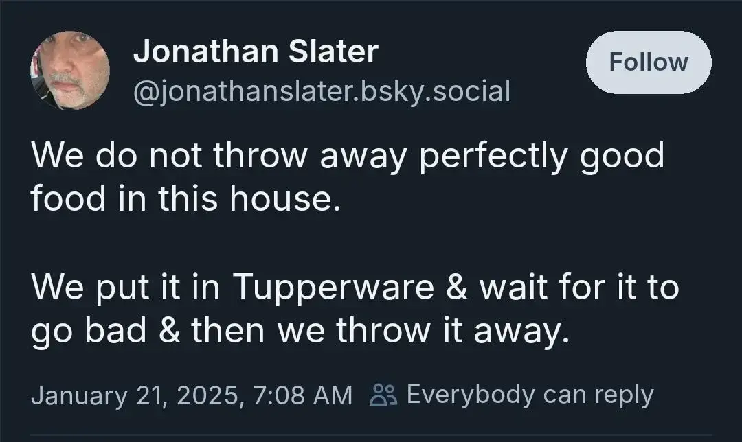 When we had our birds I used to say that food didn’t turn bad in our house, it just slowly turned into chicken food. In your house it turns into Dad’s dinner.