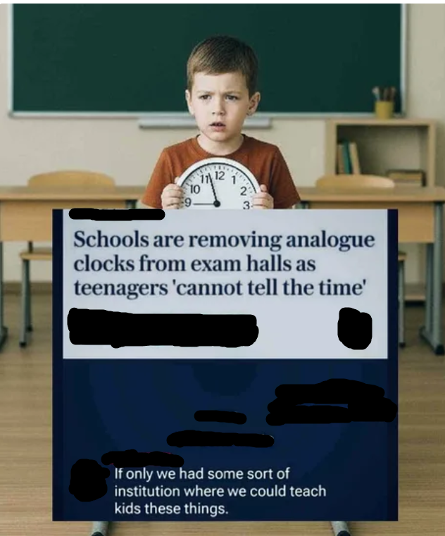 Nah let’s ditch the analog clocks and instead teach them sundials. That will really stretch their brains.