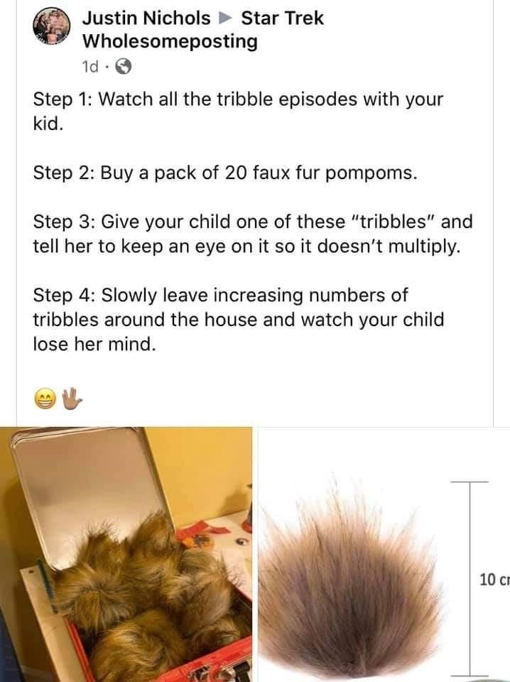 Then kiddo starts leaving the tribbles in the pantry and using them as an excuse as to where all that sugary cereal went…