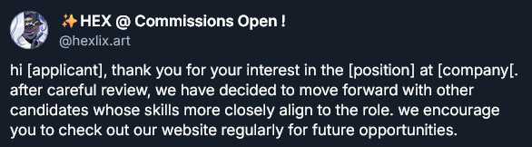 Yeah, I very much prefer the standard denied email than… *thumbleweed*
