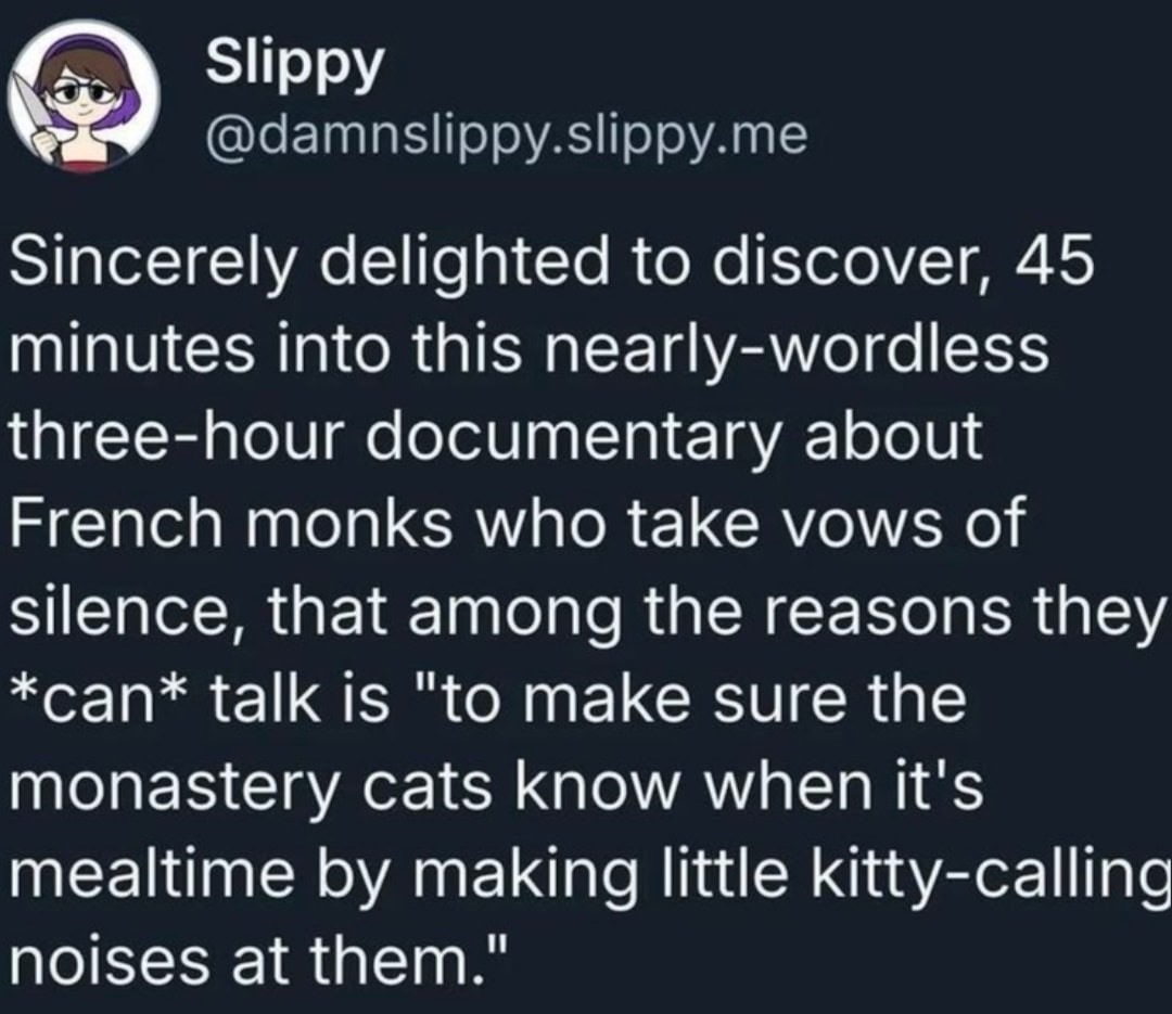 Transcription A Bluesky post from "Slippy", @damnslippy.slippy.me, with a profile picture of a woman with short, purple hair holding a knife: Sincerely delighted to discover, 45 minutes into this nearly-wordless three-hour documentary about French monks who take vows of silence, that among the reasons they \\\can\\\ talk is "to make sure the monastery cats know when it's mealtime by making little kitty-calling noises at them." :::