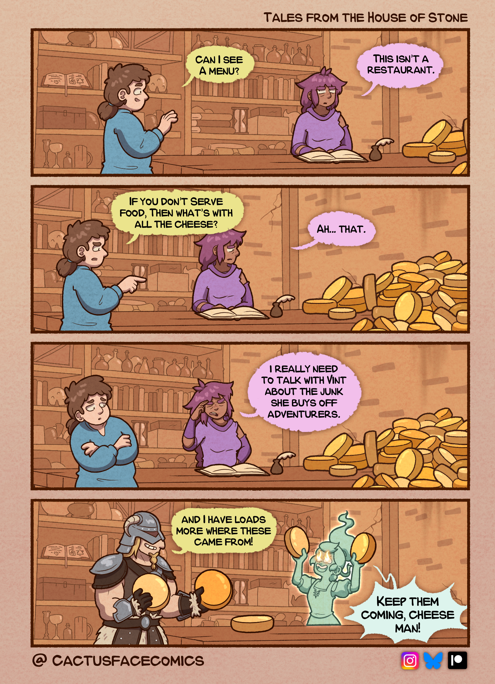 - Who sees a pile of cheese wheels and thinks they’re in a restaurant? It’s clearly a cheese shop. - C: Any Norweigan Jarlsburg, per chance. - O: No. - C: Lipta? - O: No. - C: Lancashire? - O: No. - C: White Stilton? - O: No. - C: Danish Brew? - O: No. - C: Double Goucester? - O: (pause) No. - C: Cheshire? - O: No. - C: Dorset Bluveny? - O: No. - C: Cheddar? - O: No. We don’t get much call for it. - C: But it’s the single most popular cheese in the world! - O: Not around here, sir.