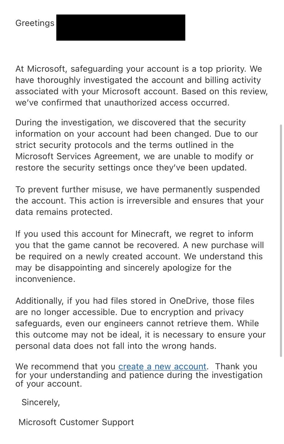 Yes its not unexpected but seeing it Live is a whole another level of disgusting Business practices. Especially the Part where They Tell him that he should buy minecraft again instead of offering a key or something like that. I know That They cant access one Drive really Unless they have a backdoor key but still straight up scummy to Tell him Theres nothing they can do regarding his Account and that his onedrive data is lost.