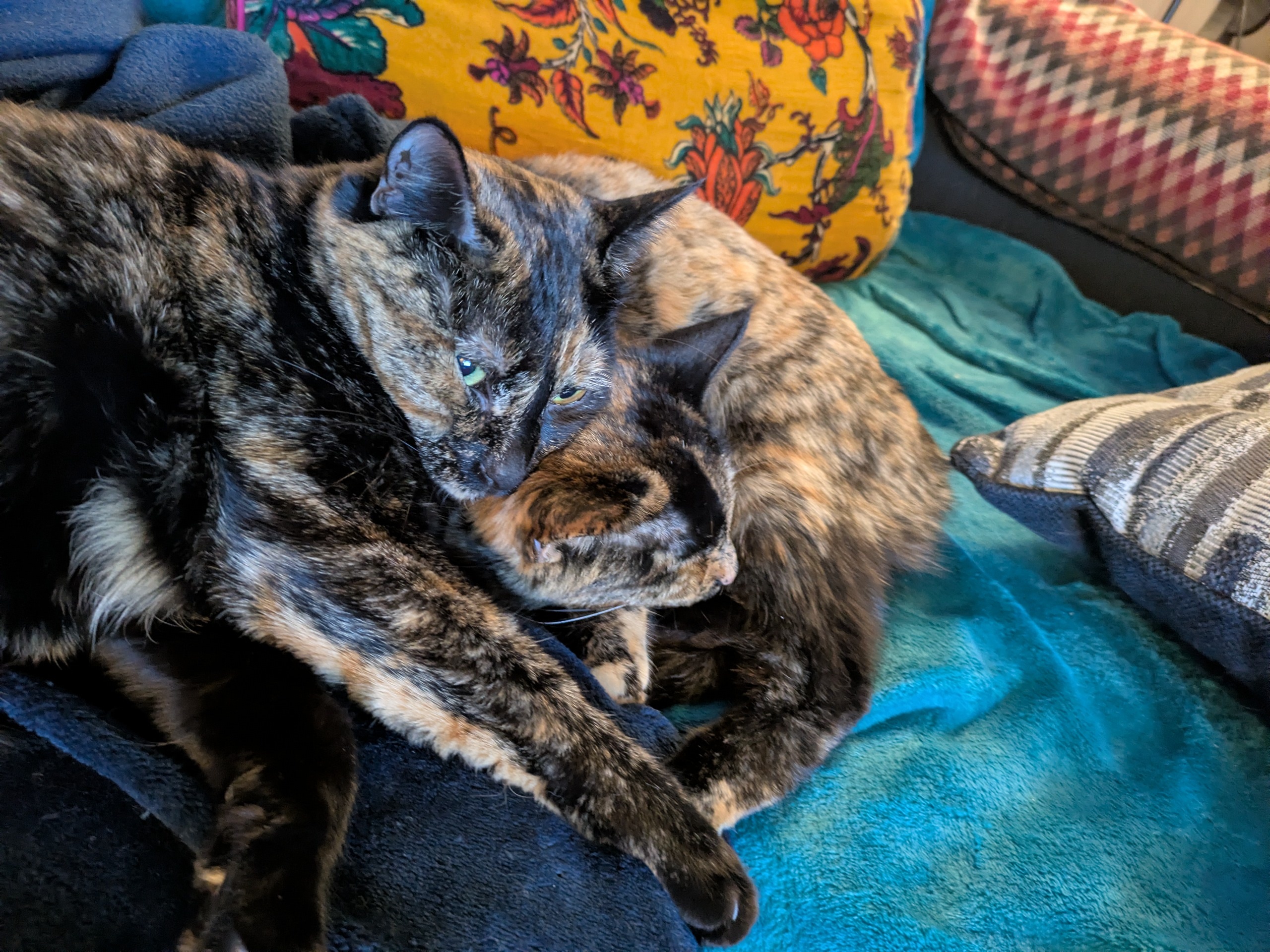 Ooh, tortoiseshells, I love them! Do they have the fabled torty skittishness? We had two torty sisters that we adopted when they were 7 weeks old; one became pretty snuggly to family, but the other was stand-offish all her life. She loved us and hung around us, but did not like to be touched.