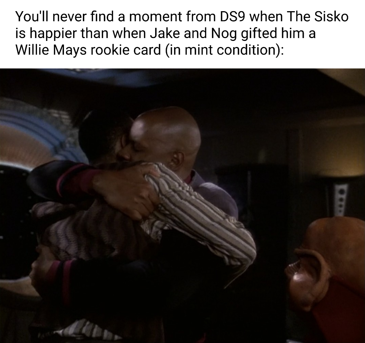 “He was captured and put in a Cardassian prison camp. Now he knew if the Cardies ever saw the baseball card it’d be confiscated. He’d be damned if any spoonheads gonna put their scaly grey hands on his limited edition baseball card, so he hid it, in the one place he knew he could hide something: his ass. Five long years, he wore this baseball card up his ass. Then when he died of dysentery, he gave me the baseball card. I hid this uncomfortable piece of cardboard up my ass for two years. Then, after seven years, I was sent home to my family. And now, little man, I sell the baseball card to you.”