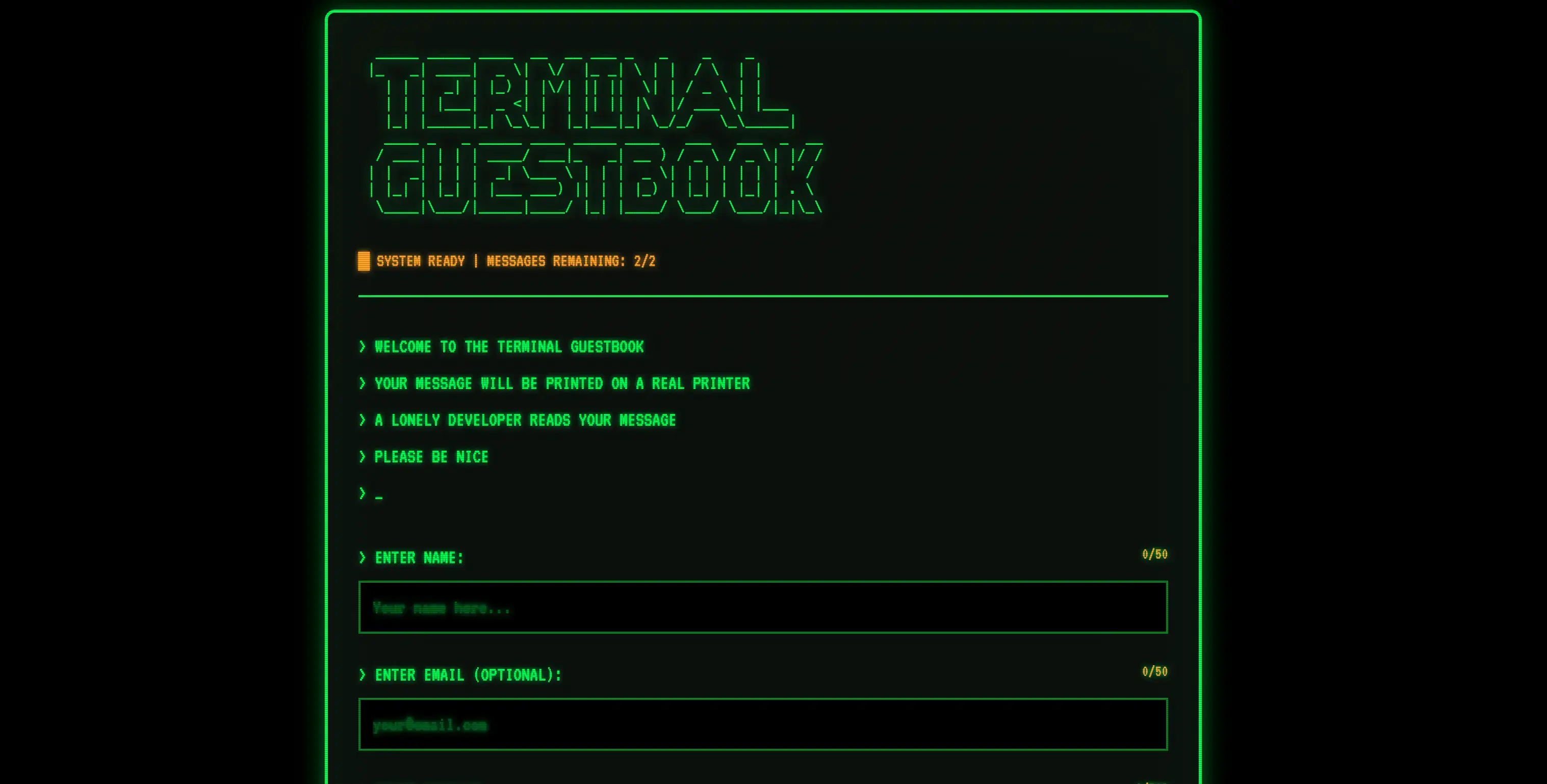 I saw this idea somewhere else and I wanted to build it for myself because I was fascinated by it. So I did. You can enter your nick name, a message (optional email address and image) and send it to me. It will print immediately and I will see your message. There’s also an easter egg that you can discover. :)
