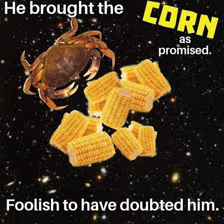The corn crab always comes through. In blackest most cornless night he brings the corn when no other other could.