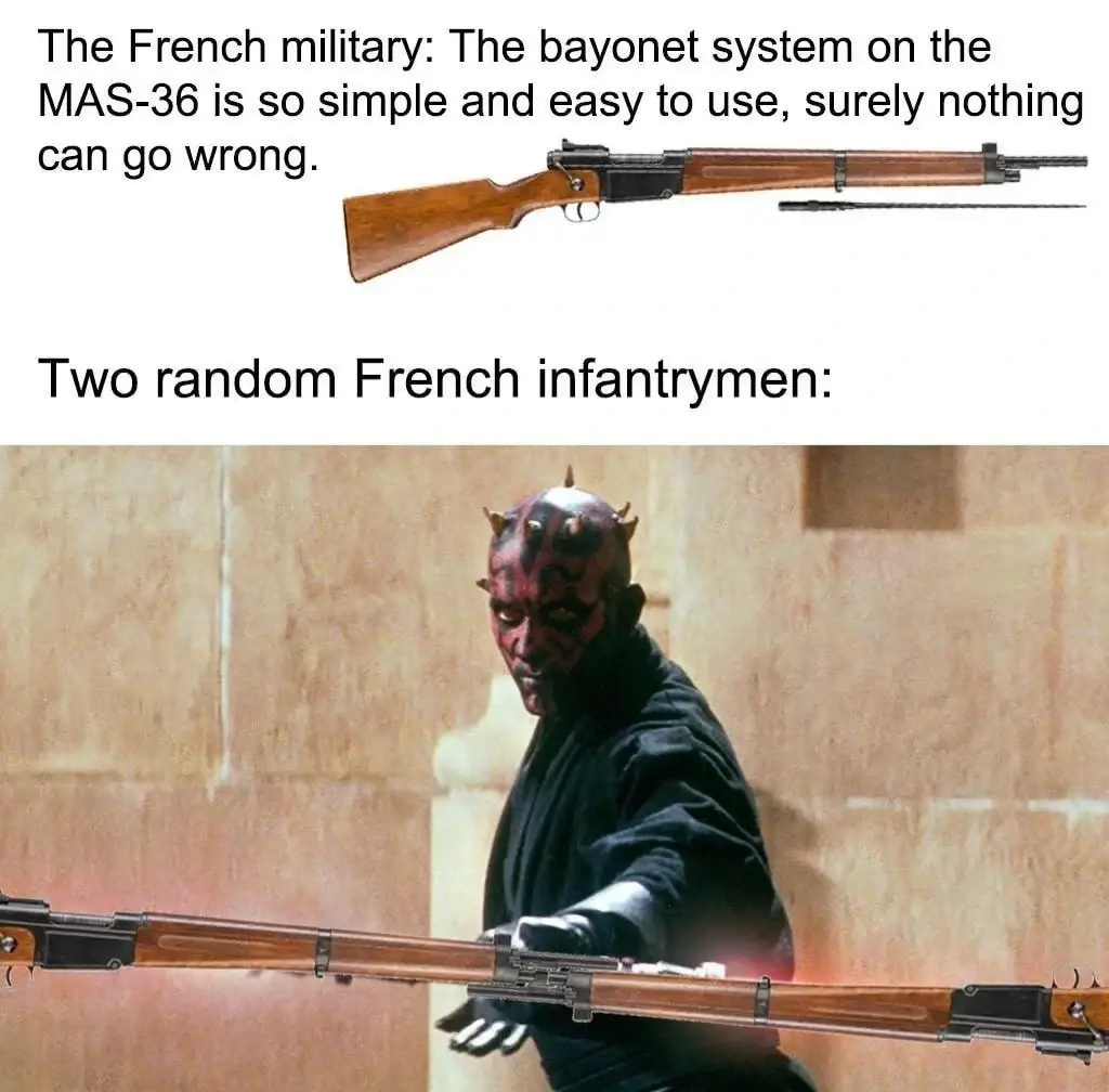 However, a handful of goofing-off French infantrymen found out that the same system could be used to ‘lock’ two rifles together, and that doing so blocked the release button… making both rifles unusable without being disassembled.