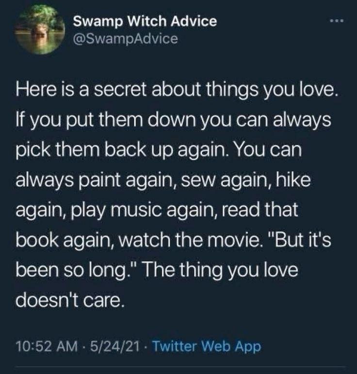 A Twitter post by Swamp Witch Advice @SwampAdvice reads “Here is a secret about things you love. If you put them down you can always pick them back up again. You can always paint again, sew again, hike again, play music again, read that book again, watch the movie. “But it’s been so long.” The thing you love doesn’t care.”