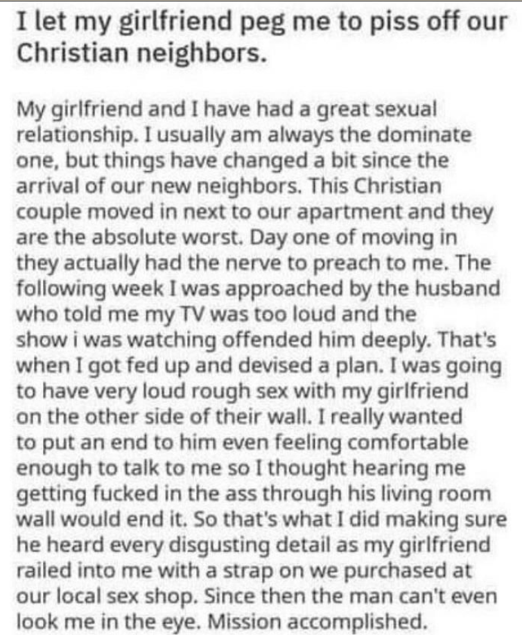 If your karma is really bad the neighbors would invited you into a wife swap. But then after you fuck the other guys wife, the husband says he’s BI and ass fucks you as the wives look on laughing