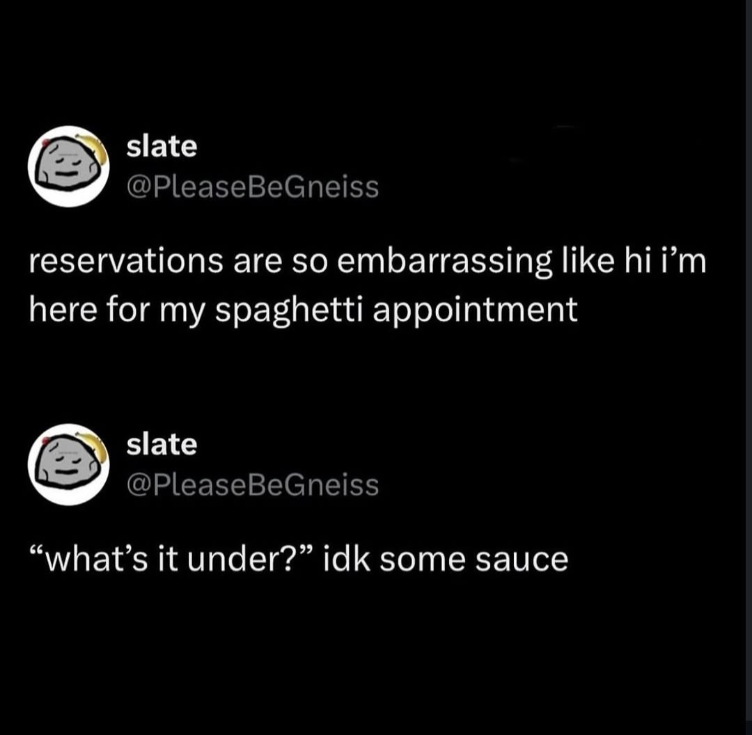 If I were to disagree with what you were reportraying they said though… The right food/time/people to me doesn’t spell making a reservation at a restaurant… that feels like rushed not putting in effort other than “having to show up” to prove you care type of deal. I suppose it would have made more sense to me if it were in the context of putting in the effort of making a loving dish and showing up for the people you wish to show you care. (That said, it also goes to shit on Thanksgiving/Christmas and what not if people are doing it out of “requirement.”