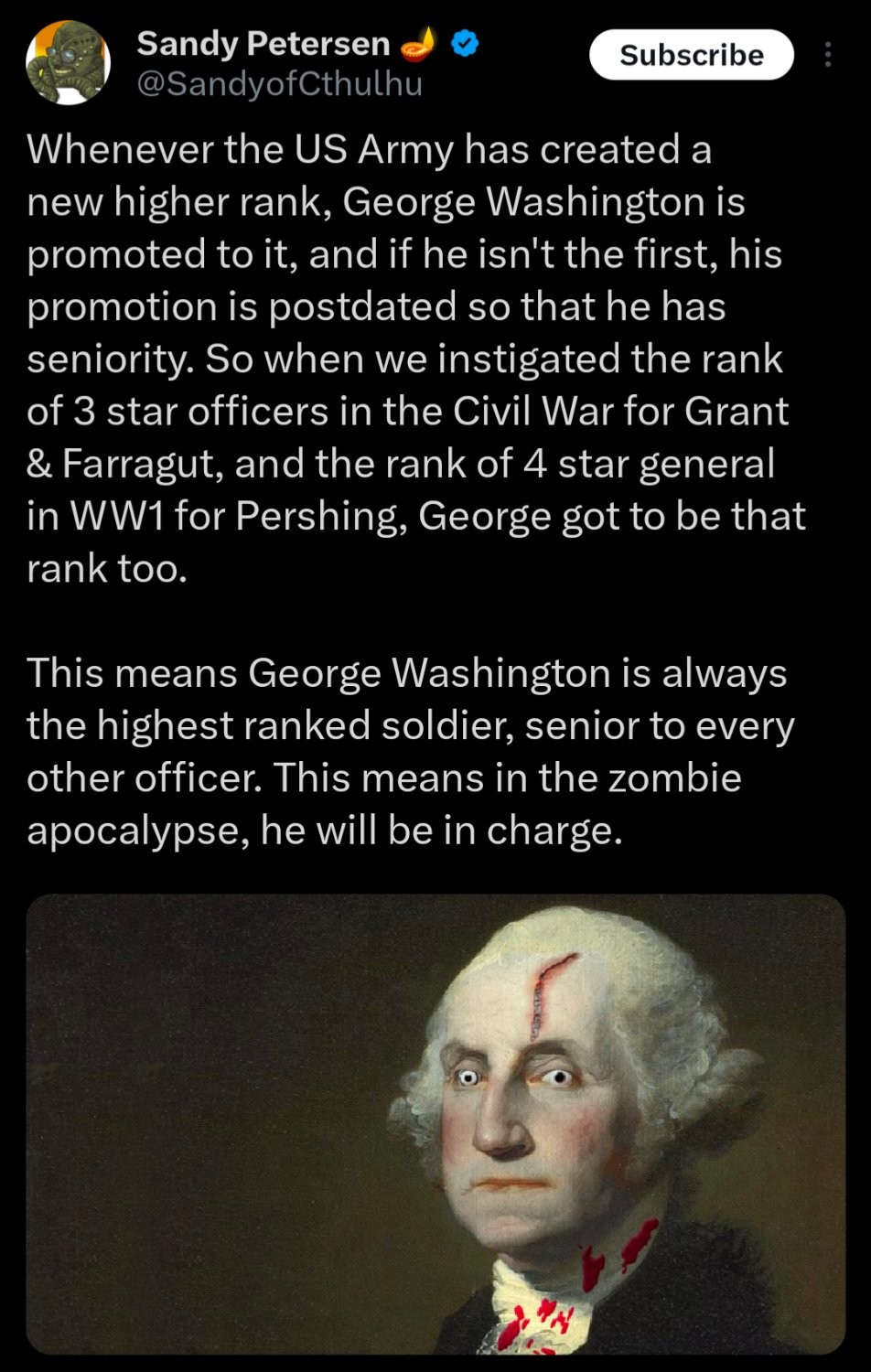 Also, I set the bar intentionally low for zombie Washington. Child rape was the bar. There’s no amount of revision of American history that has lowered Washington to Trump levels of evil yet. And I further wrote couldn’t rape kids with the expectation that zombie dicks probably fall off.