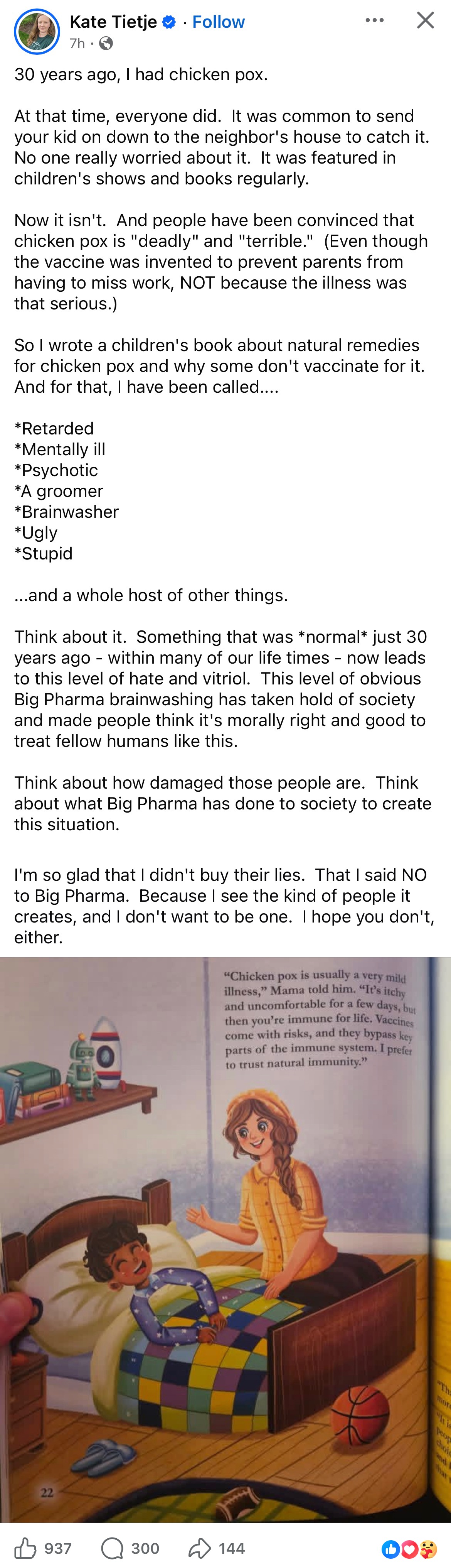 Chicken pox vaccine is a relatively recent invention. Before vaccination we knew that chicken pox was bad in kids but very bad in adults so better to get it as a kid if you had to get it at all. The vaccine changes the equation and not being able to evaluate that is a sign of stupidity. The vitriol from other parents is because she is hurting kids because she’s stupid.