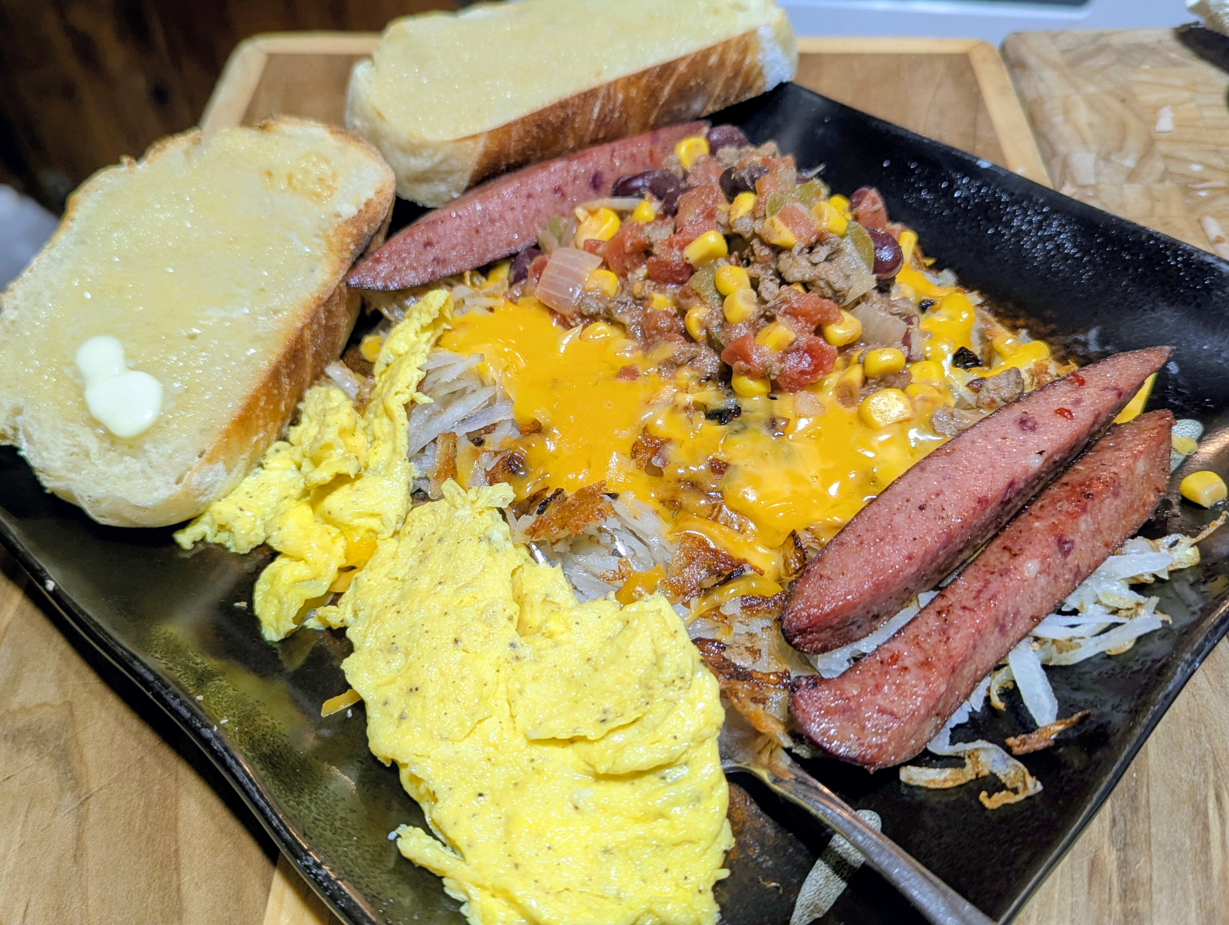 I’m cleaning out the leftovers one meal at a time. The wife wanted hashbrowns. That’s a perfect vehicle for my second to last smoked sausage, half an onion, some venison chili, half a loaf of homemade bread and the last of our eggs.