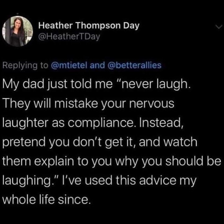 It sounds like her dad taught her the general advice, but she learned (herself) through using the advice that specifically sexual harassers stop laughing when you ask why their “jokes” are funny.