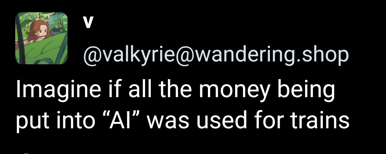 io@piefed.blahaj.zone to Microblog Memes@lemmy.worldEnglish · 16 hours agoTrains 🤧piefed.cdn.blahaj.zoneimagemessage-square58fedilinkarrow-up1851arrow-down15file-text
