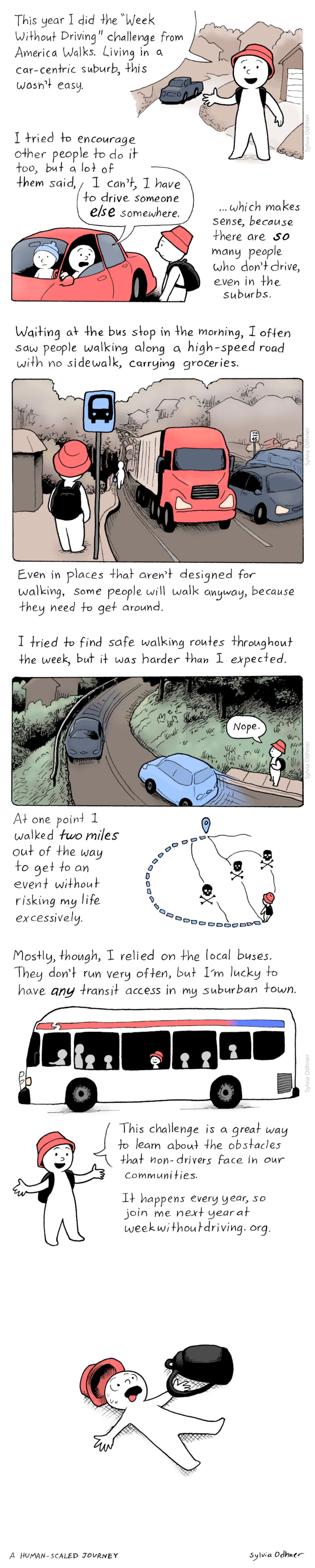 It’s nice to have those events where people try to live without a car for a while, it brings some awareness. But it’s still disappointing to see the person in the comic reaching to someone else with a car in order not to use theirs. It expresses the slight ridiculousness of this type of event.