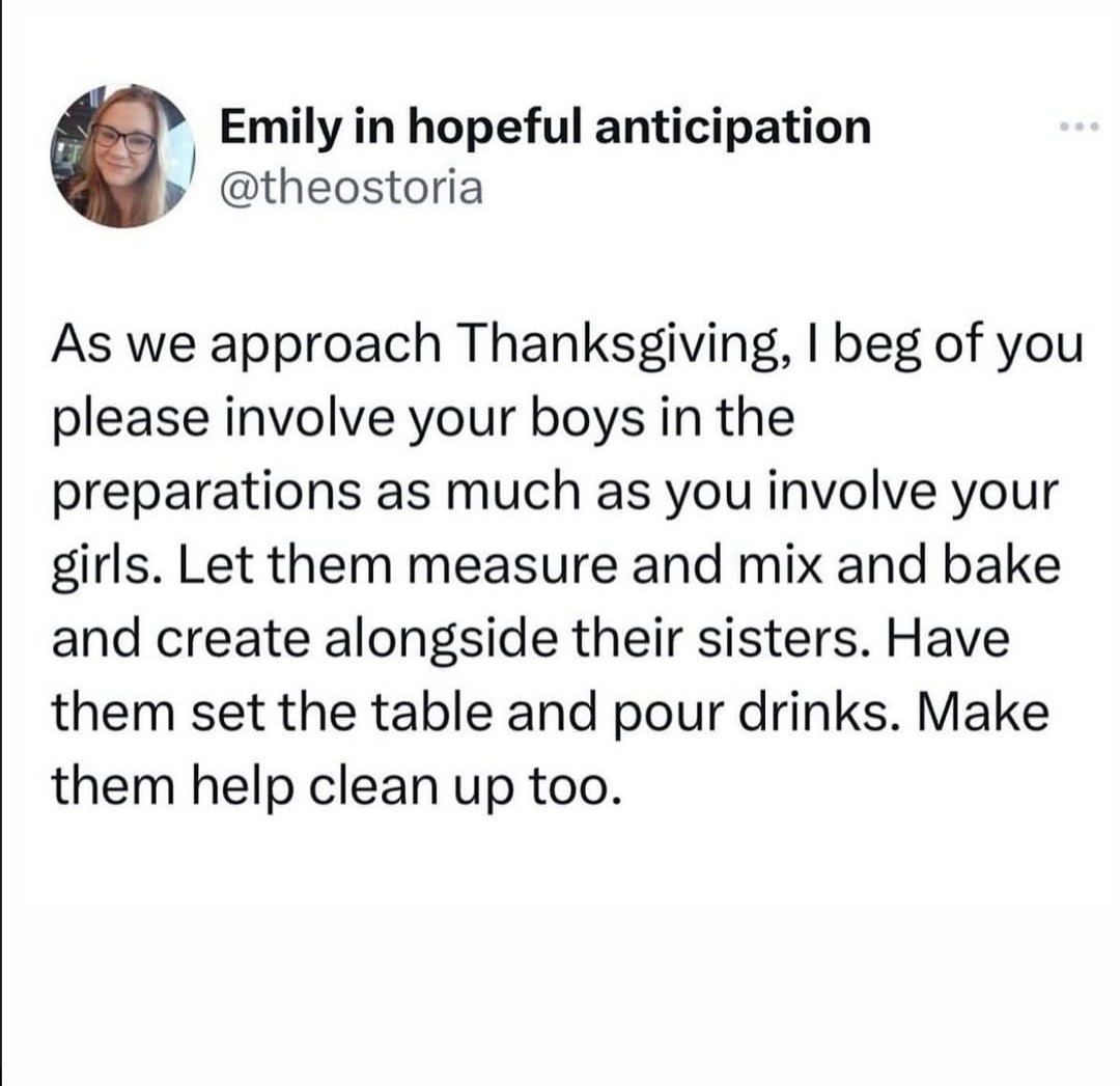 My boys are now in their 30s. They always helped with the big family dinners. Even made a couple of them on their own for the rest of us. I do not understand how anyone in my age group, Gen X, could not have raised their sons to be completely independent but somehow, I’m in a minority.