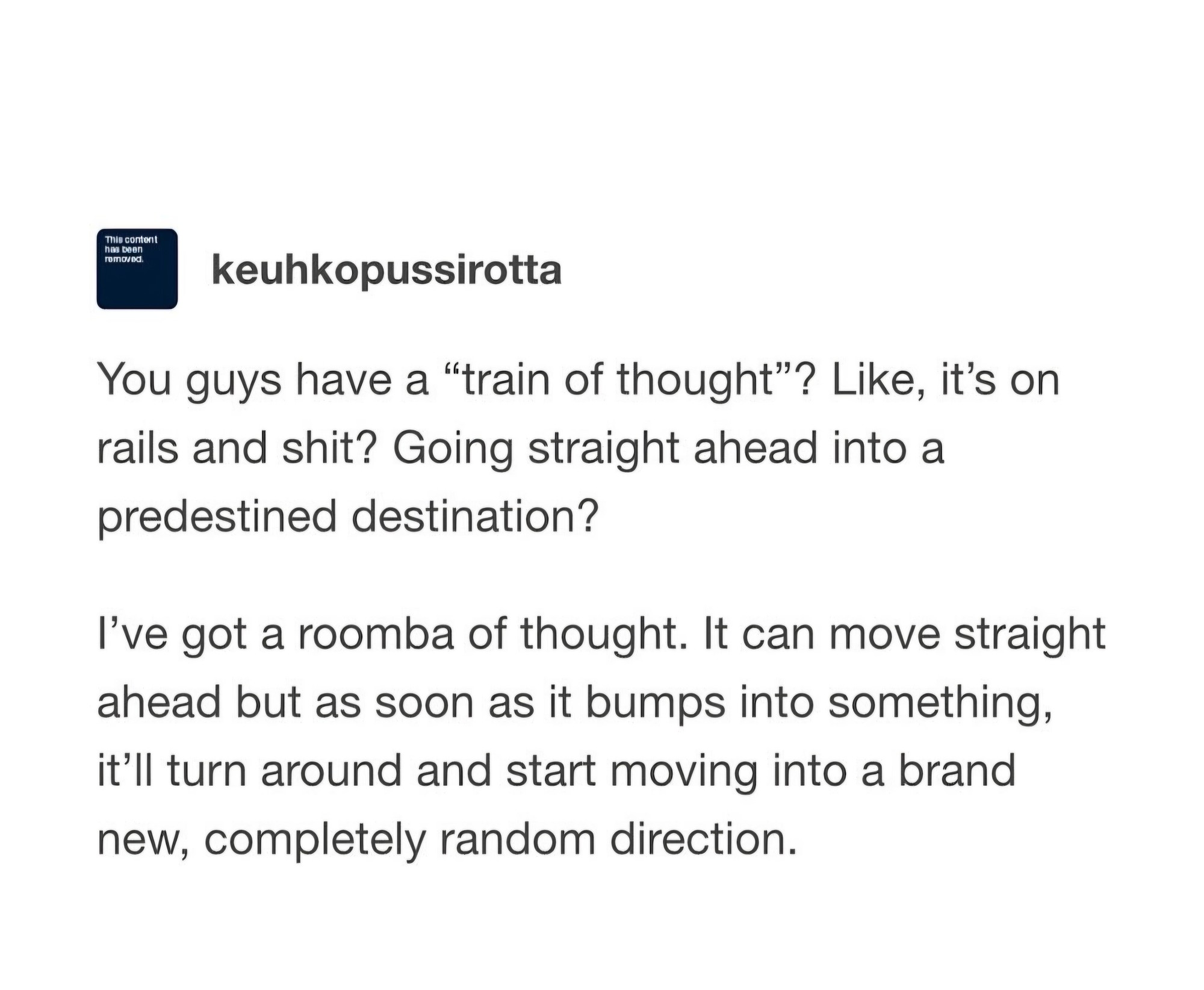 My roomba of thought ran over some shit and is now smearing it all over the place
